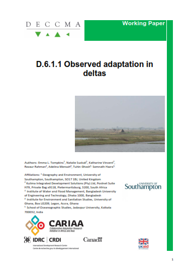A review of observed adaptations in deltas has been published by the Deltas, Vulnerability and Climate Change: Migration and Adaptation (DECCMA) Adaptation team, which includes Dr Katharine Vincent. From a review of peer-reviewed literature the team found 122 documented adaptations: 93 from the Ganges-Brahmaputra-Meghna; 15 from the Volta in Ghana, and 14 from the Mahanadi in India. The bulk of the adaptations are agriculture- and water-related. DECCMA is currently conducting a survey of 6000 households in the three deltas which will add to the evidence on adaptations.