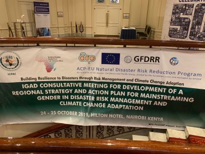 Dr Katharine Vincent is in Nairobi this week to undertake consultations with stakeholders to inform a Regional Strategy for Mainstreaming Gender in Disaster Risk Management and Climate Change Adaptation for the Intergovernmental Authority on Development (IGAD) region. This follows on from a consultative dialogue that she facilitated last week, attended by the gender, DRM and CCA focal points from the majority of the IGAD member states. After Nairobi she will travel to Uganda to continue consultations there. The assignment, in partnership with Cowater International, is due to be complete by March 2020.